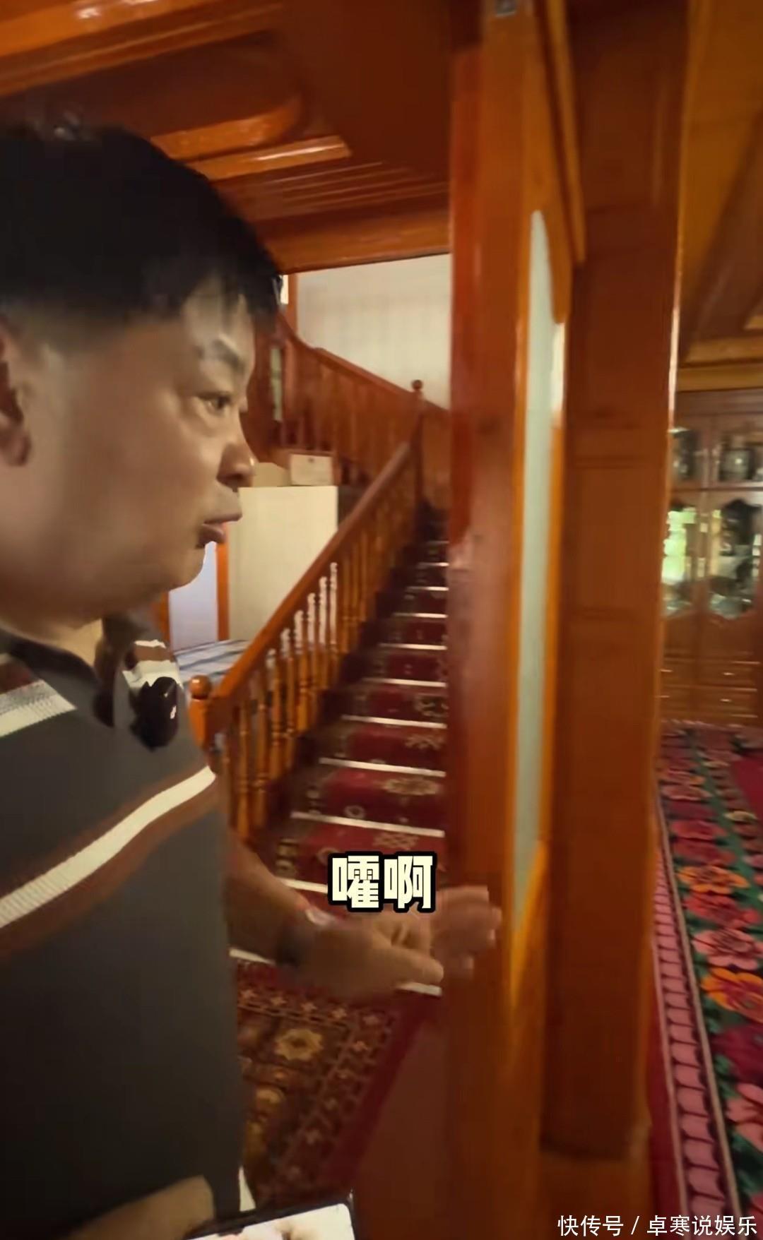 聚餐房间,位于二楼的餐厅;房间内部柱子、楼梯、吊顶使用的都是木料,不仅显得温馨,而且防潮保暖。主人家格外宽敞高大的房间,让洪剑涛忍不住“嚯”了一声。
